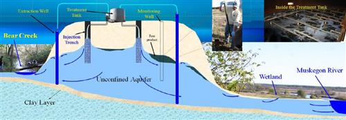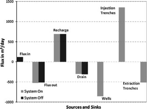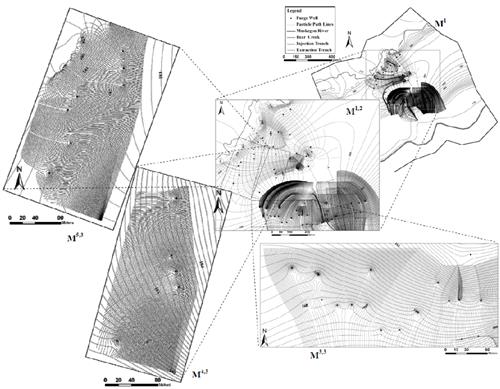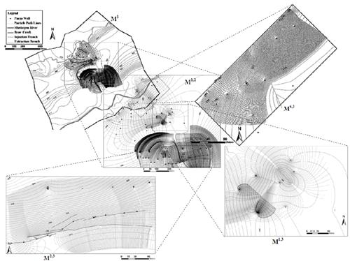 We performed a simulation of a complex contaminant capture system at one of the largest groundwater pump-and-treat remediation operations in Michigan. The hierarchical modeling system was calibrated to water level measurements collected from 208 monitoring wells located both on-site and in its immediate proximity and flux measurements from 6 trenches on-site. Systematic hierarchical simulations, including forward and reverse particle tracking as well as integrated water budget analyses, were performed to study the on-going remediation. The hierarchical modeling results show that some contamination leaked off-site because of small-scale inefficiencies in the design of the remediation system.
